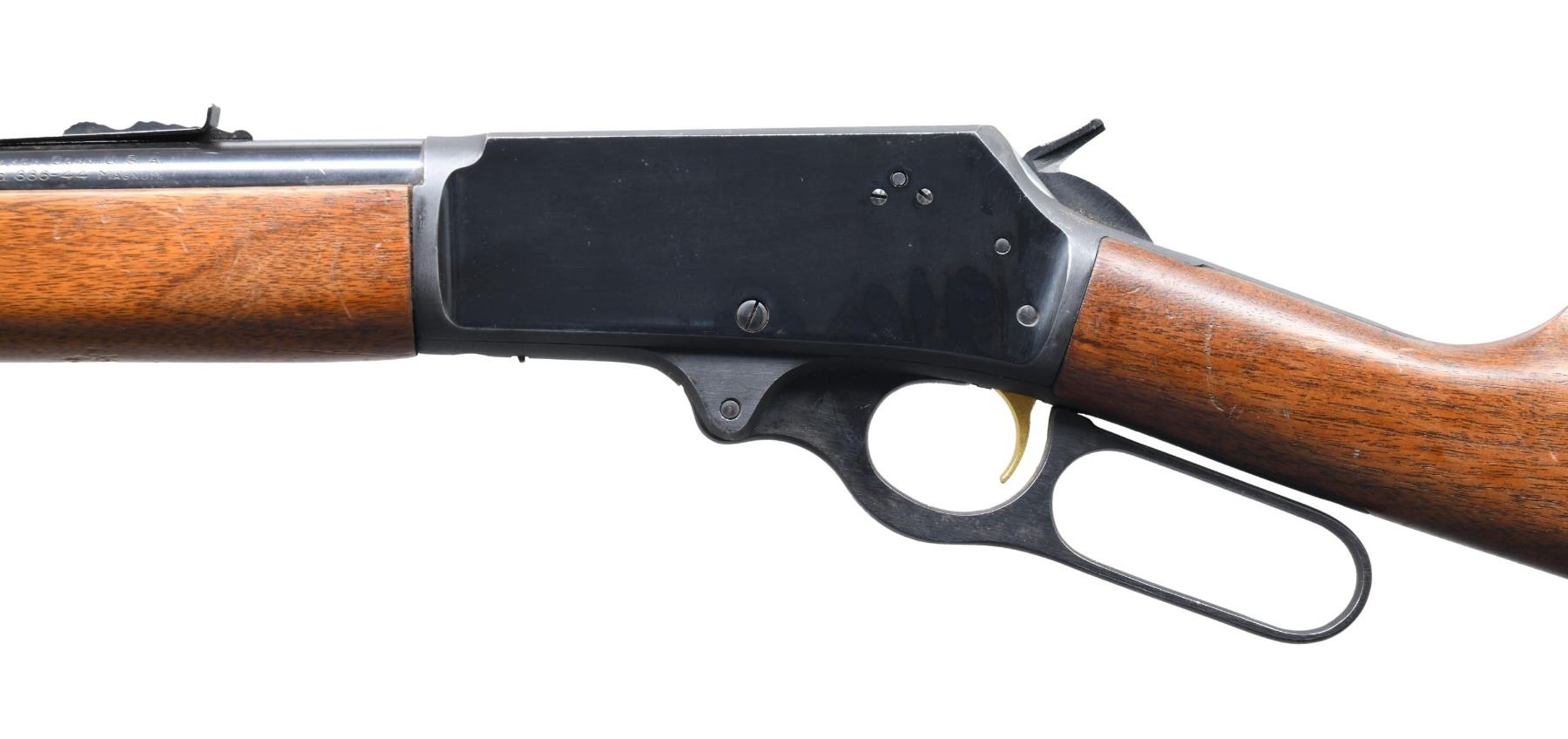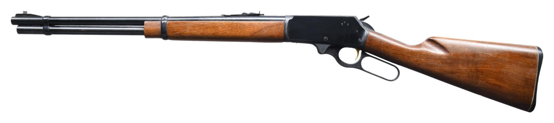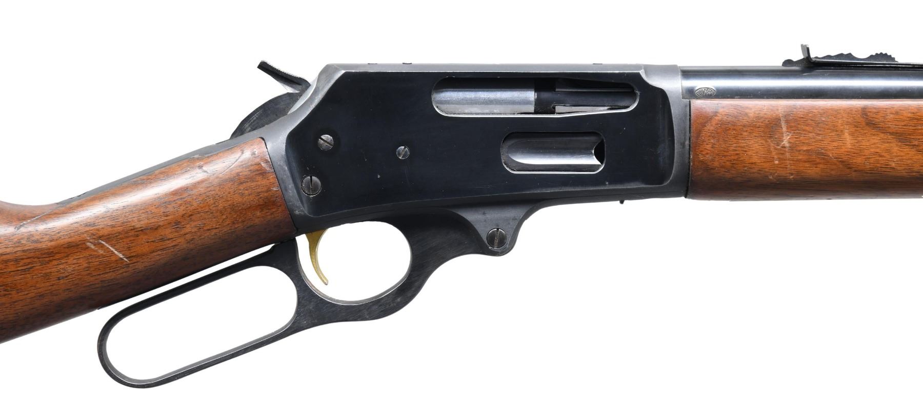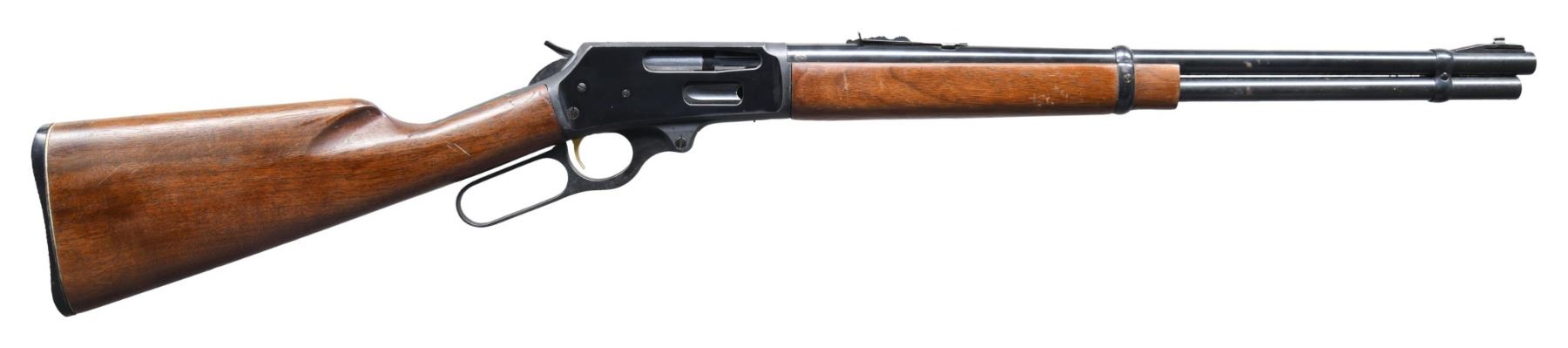 CARBINE. Cal. 44 Mag. S# Z48267. Approx. 2,823 mfg. 1963-1964, where it eventually became the 336 Texan. Rnd. Micro-groove 20" bbl. Bead front sight & elevator rear sight. Blue finish. 10 Shot tubular mag. Receiver drill & tapped for scope mount & has gold washed trigger. Walnut stock set w/ Marlin bullseye & buttplate. CONDITION: very good original blue with noticed spots of peppery oxidation throughout mag. tube. Good original wood finish shows numerous large dings & handling marks throughout along with large areas of worn finish on both sides of buttstock. Buttpad shows scrapes & brown residue. Very good strong & shiny rifling. (25-4436/MD). CURIO. $500-750.