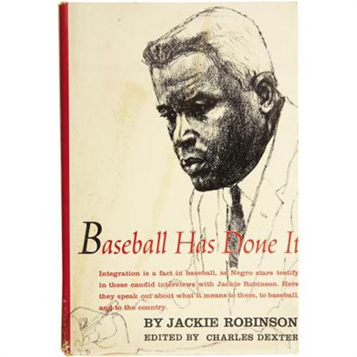 <B>1964 Jackie Robinson Signed Book.</B></I> "The right of every American to first-class citizenship is the most important issue today," begins the brave racial pioneer's <I>Baseball Has Done It,</B></I> recounting his historic crossing of our National Pastime's color barrier and the challenges that still lay ahead. Given Robinson's supreme relevance to the integration of baseball, this book is widely considered to be one of the most attractive media for his autograph. We find on the opening blank page of this first edition hardcover, with "Best Wishes, Jackie Robinson" provided in 10/10 blue ink. A small degree of toning is evident on this page but to no visual detriment, and the book is otherwise in fine condition with the original dustjacket showing some toning and edge wear but remaining complete and solid. An important keepsake from one of the most important and inspiring figures of the twentieth century. <I>LOA from PSA/DNA.</B></I><BR><BR><b>Shipping:</b> Books & Catalogs (<a target="_blank" href="http://www.heritageauctions.com/common/shipping.php">view shipping information</a>)