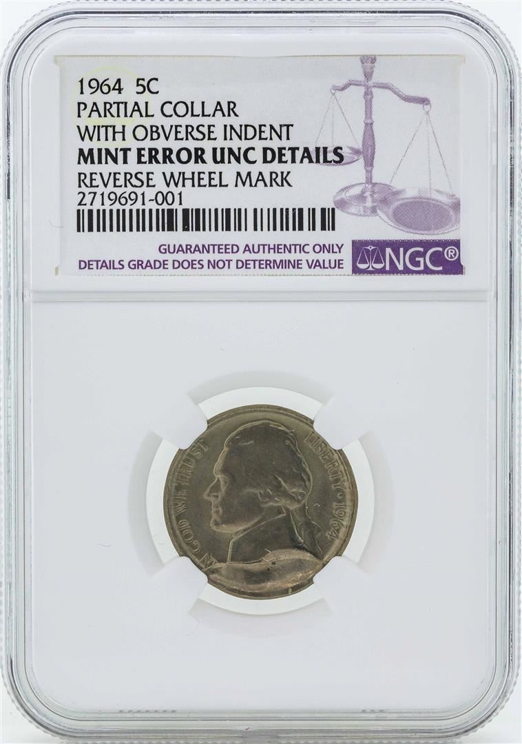 One 1964 Jefferson Nickel Partial Collar Obverse Indent Coin NGC Mint ERROR Unc Details. NGC Certified.