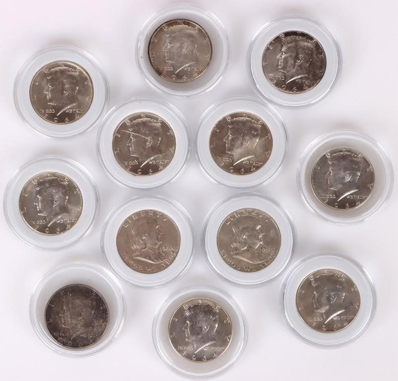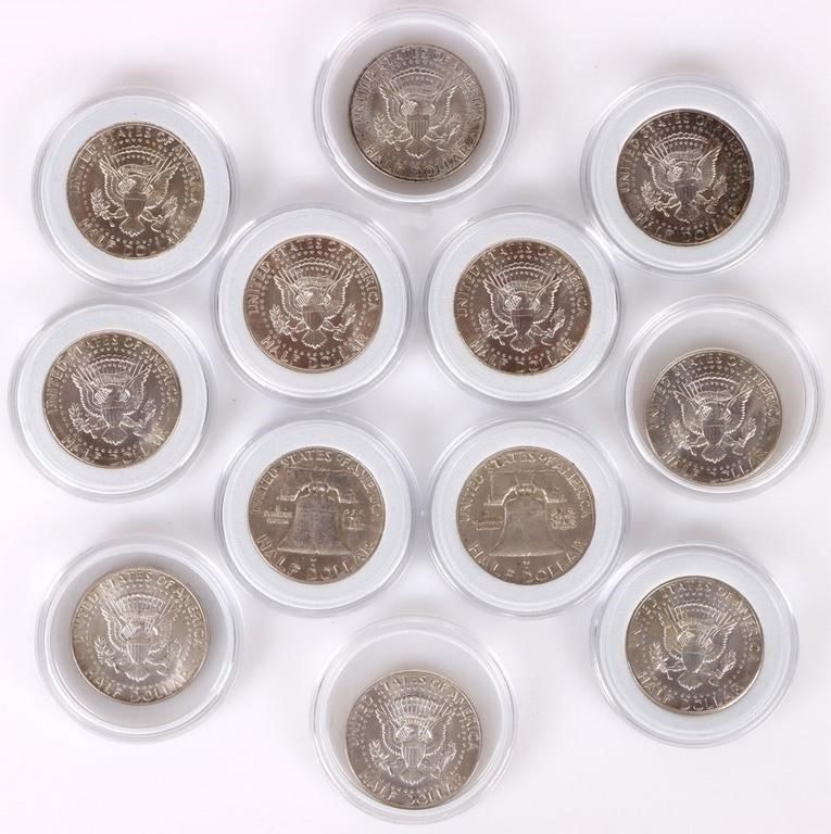 1964 Kennedy and Franklin Half dollars - 90% silver - lot of 12. Coins are mid to high grade. Franklin half dollars include one 1958 and 1960.