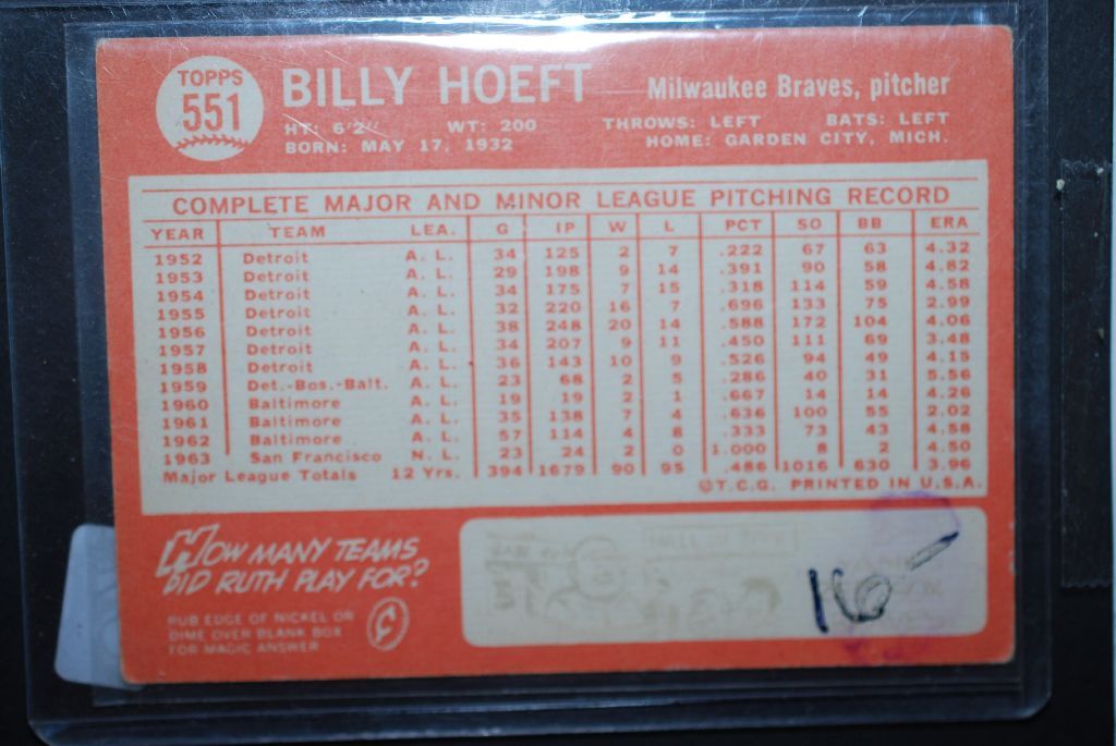 1964 MLB Billy Hoeft Milwaukee Braves Baseball Trading Card; EST. $5-10