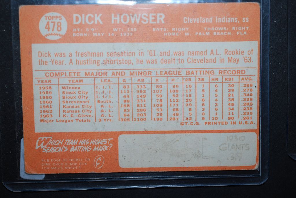 1964 MLB Dick Howser Cleveland Indians Baseball Trading Card; EST. $5-10