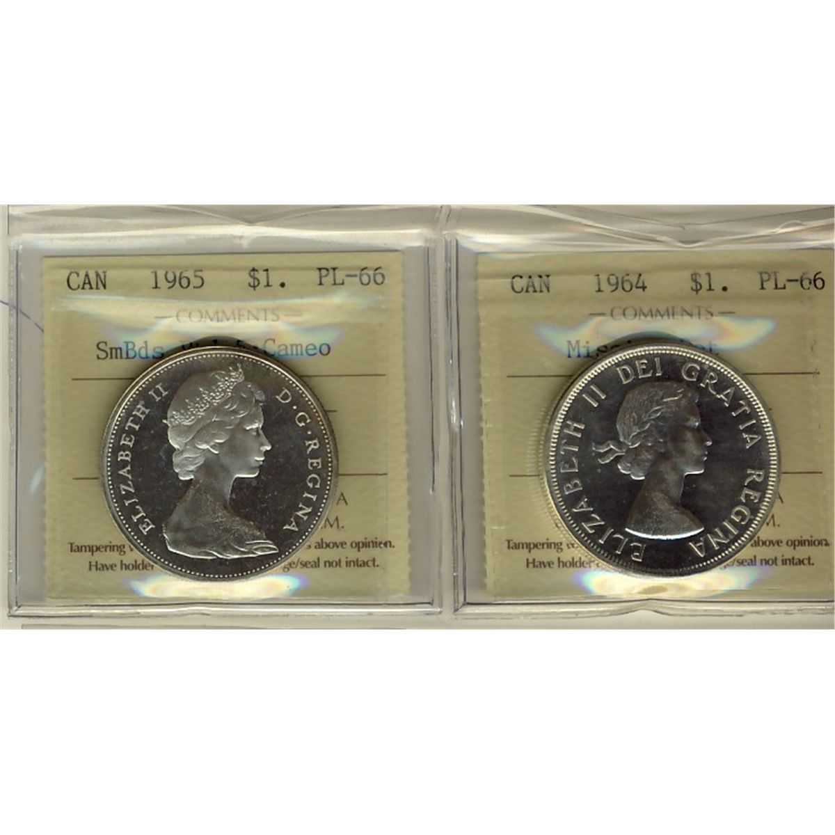 1964 Missing Dot $1 & 1965 SmBds Ptd 5 ICCS PL66. Lot of 2 coins with 1965 designated Cameo.