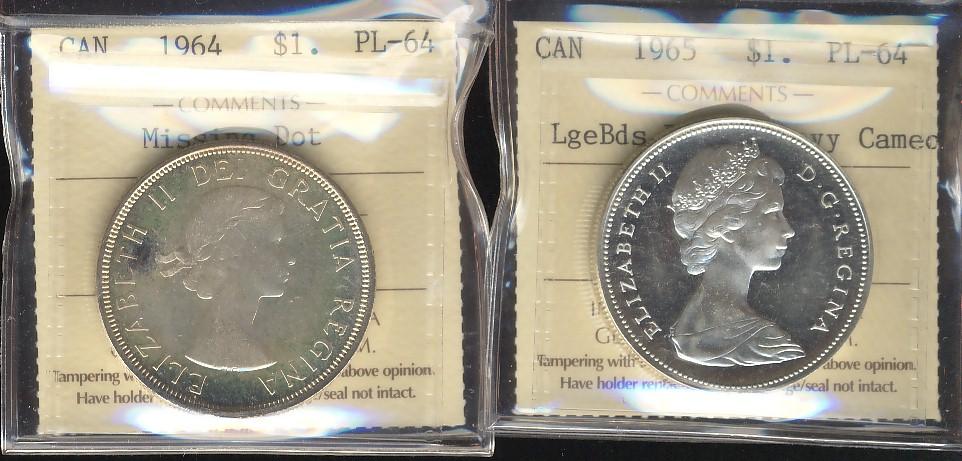 1964 Missing Dot, 1965 LgeBds Blt 5 Heavy Cameo $1 both ICCS PL64,