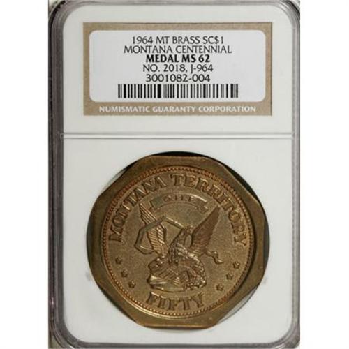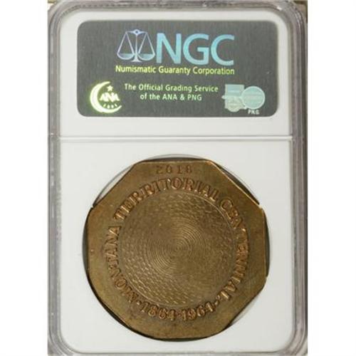 <B>1964 Montana Territorial Centennial Octagonal MS62 NGC.</B></I> J-964, unlisted in Hibler-Kappen (struck after printing). Antiqued brass. Serial number 2018 stamped at the upper reverse. The elegant old-brass surfaces of this lightly marked example show occasional hints of green-gold. An attractive piece.<BR><I>From The Jankovsky Collection of California Slug Facsimiles.</B></I><BR><BR><b>Shipping:</b> Coins & Currency (<a target="_blank" href="http://www.heritageauctions.com/common/shipping.php">view shipping information</a>)