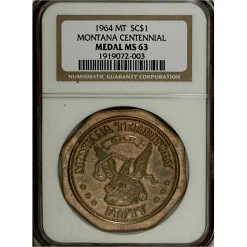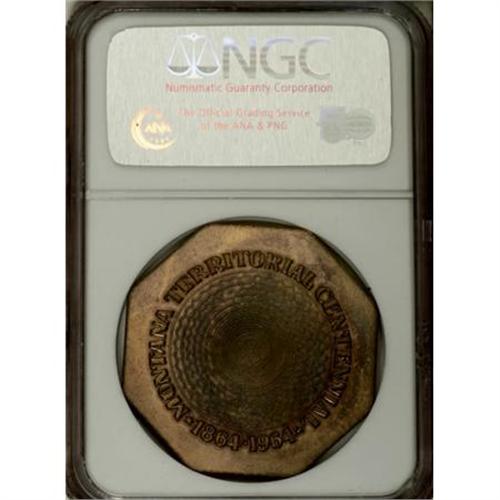 <B>1964 Montana Territorial Centennial Octagonal MS63 NGC.</B></I> J-964, unlisted in Hibler-Kappen (struck after printing). Antiqued brass. This Select Humbert facsimile piece, which commemorates the centennial of the Montana Territory, is well struck with luminous olive-brown surfaces overall. The interior reverse shows lovely blue and lavender shadings within the circle.<BR><I>From The Jankovsky Collection of California Slug Facsimiles.</B></I><BR><BR><b>Shipping:</b> Coins & Currency (<a target="_blank" href="http://www.heritageauctions.com/common/shipping.php">view shipping information</a>)