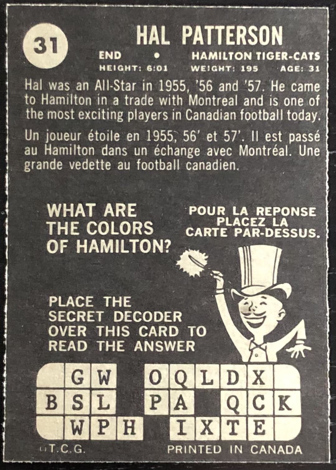 Card #31 CFL, football, vintage, OPC, hall of fame
