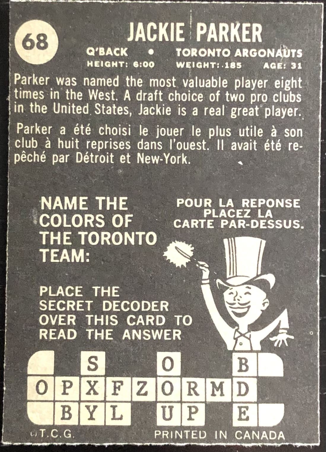 Card #68 CFL, football, vintage, OPC, hall of fame