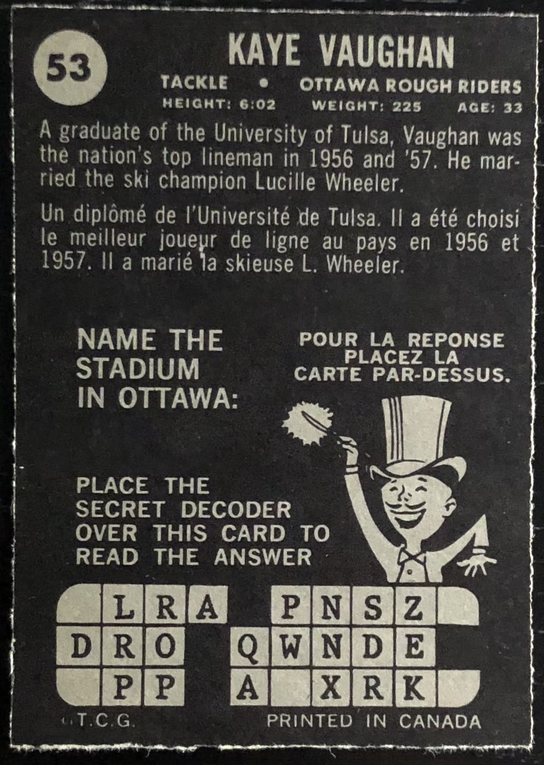 Card #53 CFL, football, vintage, OPC, hall of fame