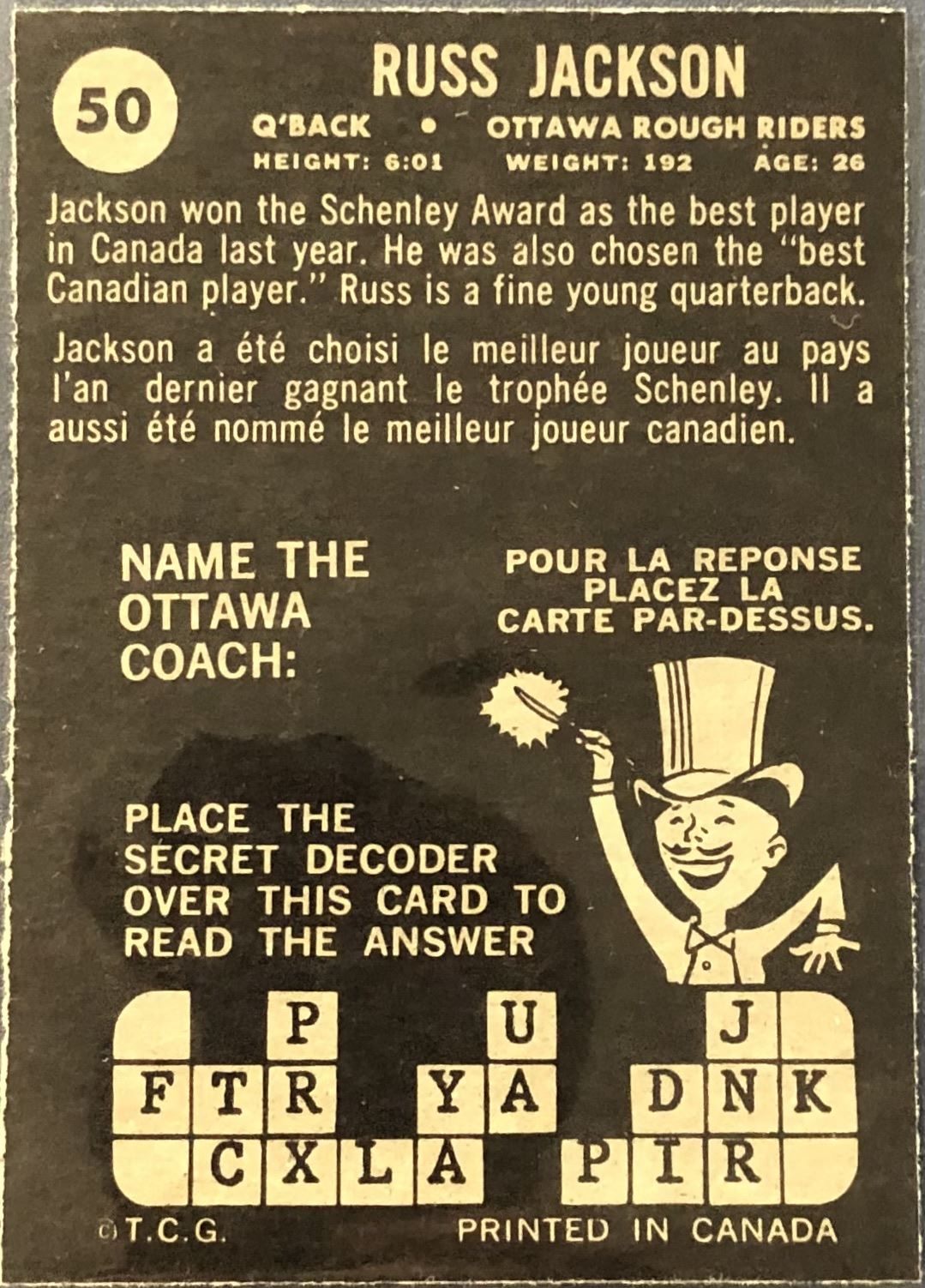 Card #50 vintage, CFL, OPC, football, hall of fame