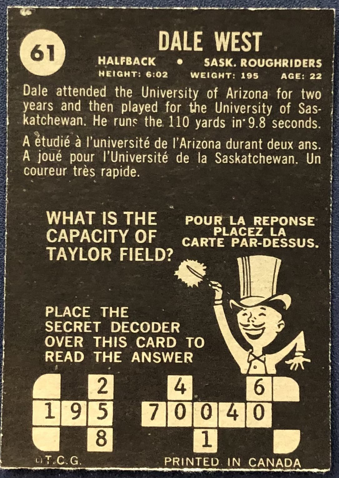 Card #61 CFL, football, vintage, OPC, hall of fame