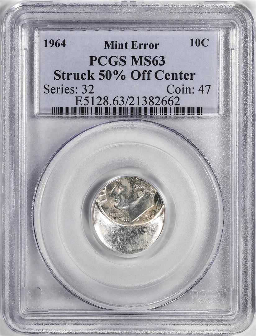 One 1964 Roosevelt Dime Coin Mint ERROR Struck 50% Off Center PCGS MS63. PCGS Graded.
