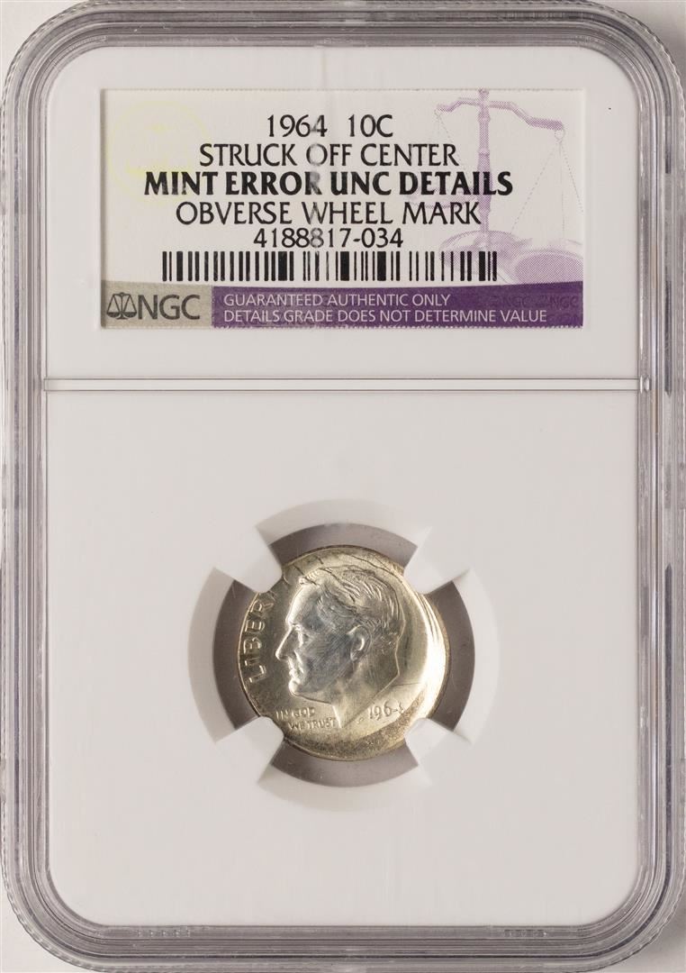 One 1964 Roosevelt Dime Coin NGC Mint Error Off-Center UNC Details . NGC Certified.