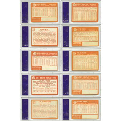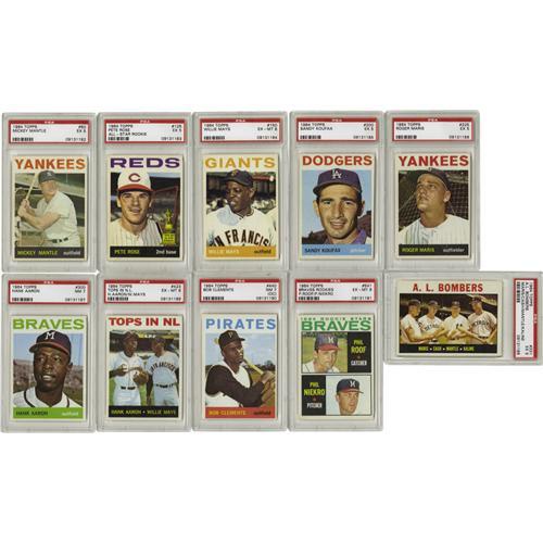 <B>1964 Topps Baseball Complete Set (587).</B></I> The 1964 Topps set is a 587-card issue which is considered by many as being among the company's best efforts. A total of 10 cards have been graded by PSA with an aggregate SMR value of $710. Graded cards - <B>PSA 7:</B></I> #300 Aaron, 440 Clemente (OC); <B>PSA 6:</B></I> #150 Mays, 423 Tops In NL, 541 Niekro; <B>PSA 5:</B></I> #50 Mantle, 125 Rose, 200 Koufax, 225 Maris, 331 A.L. Bombers. Ungraded cards include #9 NL HR Leaders (EX), 21 Berra (EX/MT), 55 Banks (EX/MT), 136 World Series Game (EX/MT), 210 Yastrzemski (EX/MT), 287 Conigliaro (EX), 380 Ford (NM), 400 Spahn (NM), 460 Gibson (EX/MT), 540 Aparicio (EX), 543 Uecker (MC), 547 Hodges (EX/MT), 550 Hubbs (EX), 570 Mazeroski (MC). Set grades a consistent EX to EX/MT or better with the exception of occasional miscut card.