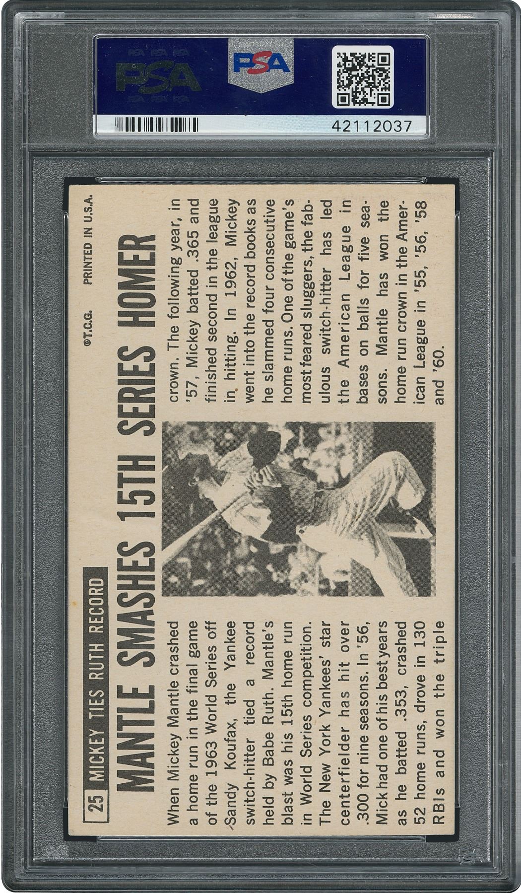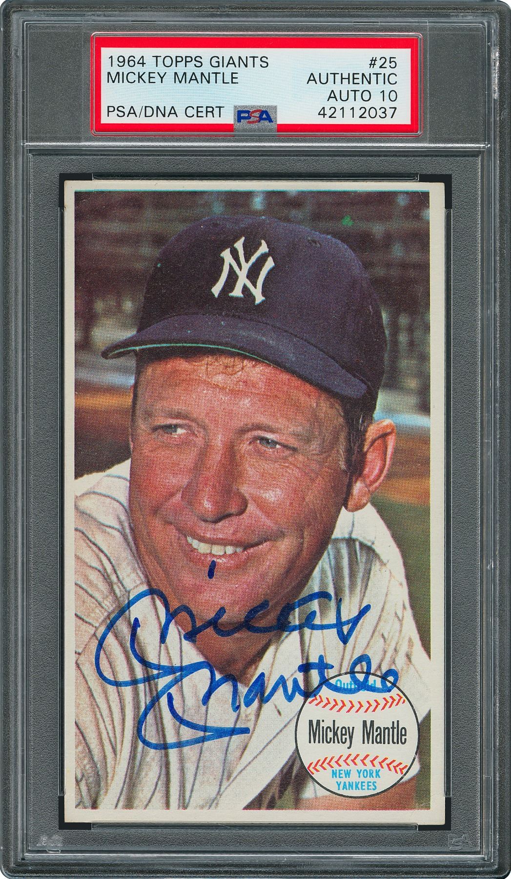 Authenticated and graded by PSA/DNA GEM MINT 10. A pristine blue felt tip signature, "Mickey Mantle," placed perfectly across the bottom portion of the card. Always an in-demand autograph, the Mantle signature on the 1964 Topps Giants issue is highly desirable as one of the keys to completing a signed Giants set.