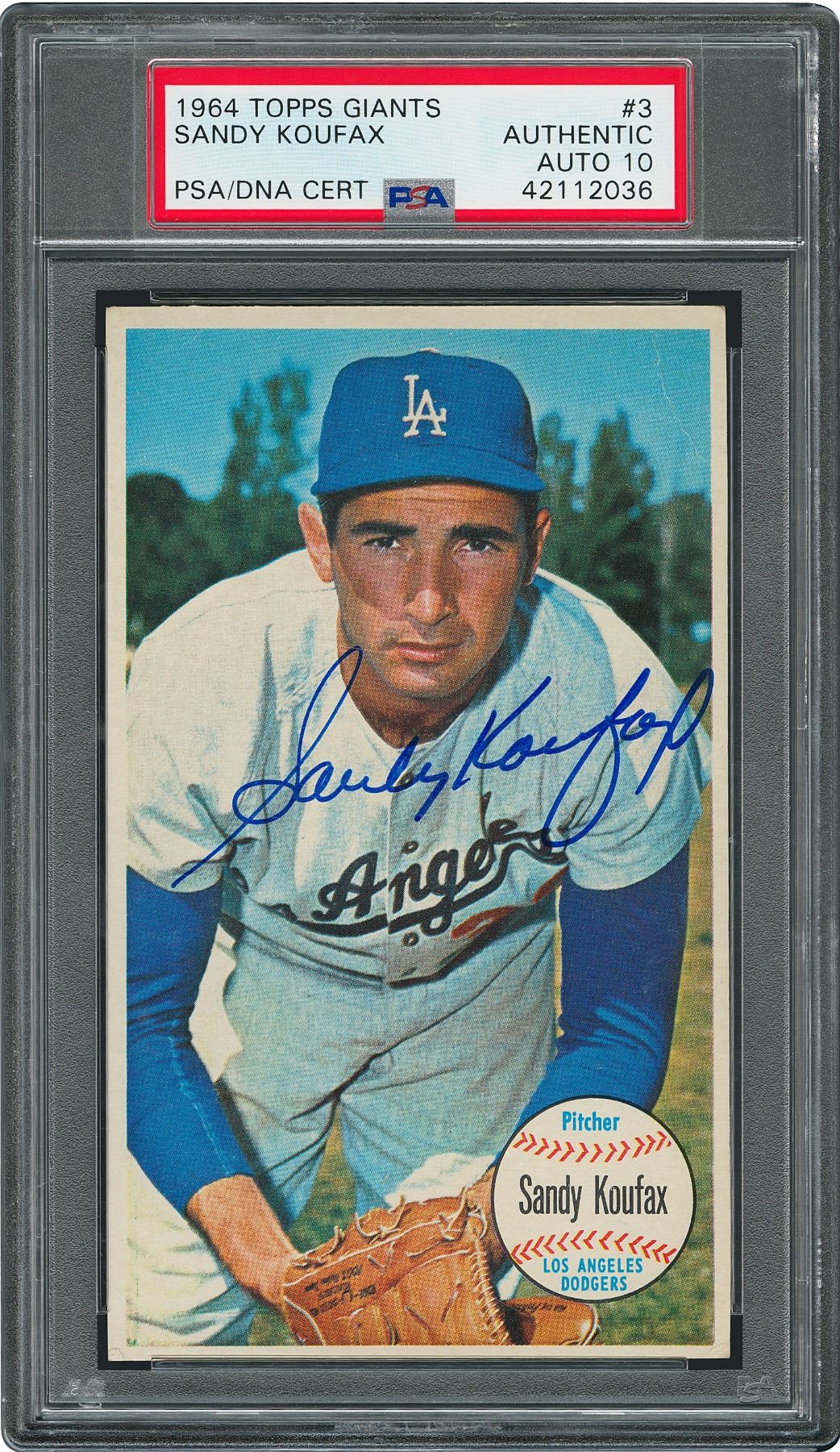 Authenticated and graded by PSA/DNA GEM MINT 10. A pristine blue felt tip signature, "Sandy Koufax," placed neatly across the light-gray jersey of this single-printed card of the Dodger pitching great.