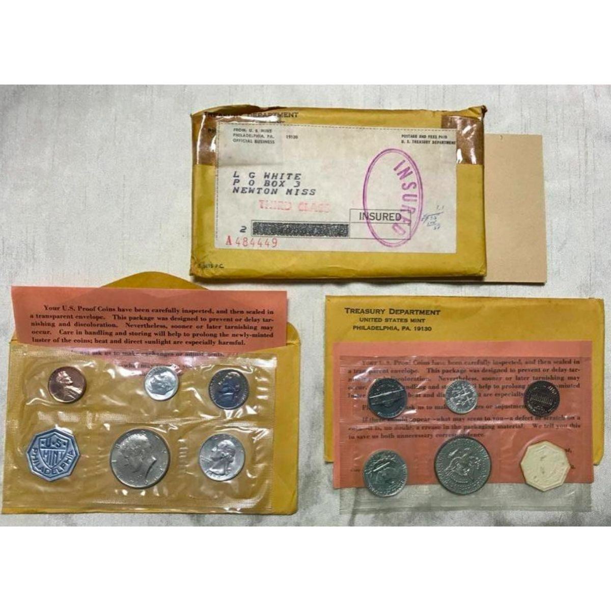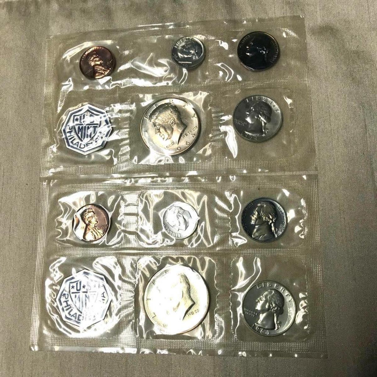 1964 U.S. Silver Proof Coin Sets, ( 2 total ) GEM Proof in original government packaging, with original mailing envelope, addressed to sender. Recently discovered in a safe in Mississippi where they have been stored for decades.  Not only was 1964 the first year of issue for the Kennedy Half Dollar in proof sets, it was also a new all-time high mintage for proof sets with 3,950,762 sets minted and sold. 1964 was also the last year the regular issue 90% silver coins would be minted. The next year, the silver was eliminated from the quarter and dime and was reduced to 40% for the Kennedy Half Dollar. This proof set included: the Kennedy Half Dollar, Washington Quarter, Roosevelt Dime, Jefferson Nickel & the Lincoln Cent. This set was originally packaged in the "flat pack" packaging where each coin was sealed individually in cellophane before being placed between to pieces of cardboard and stuck into a yellow envelope. Â