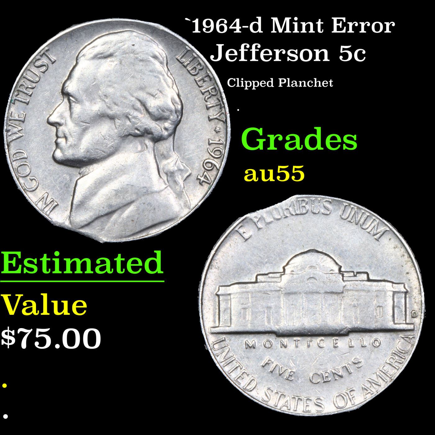 `1964-d Mint Error Jefferson Nickel 5c Grades Choice AU.