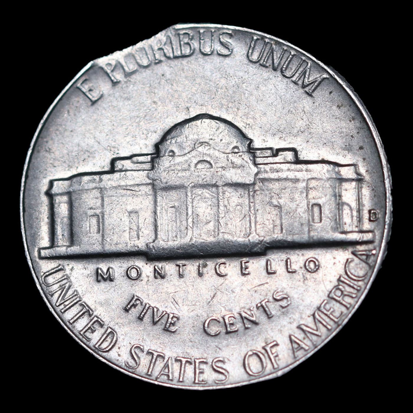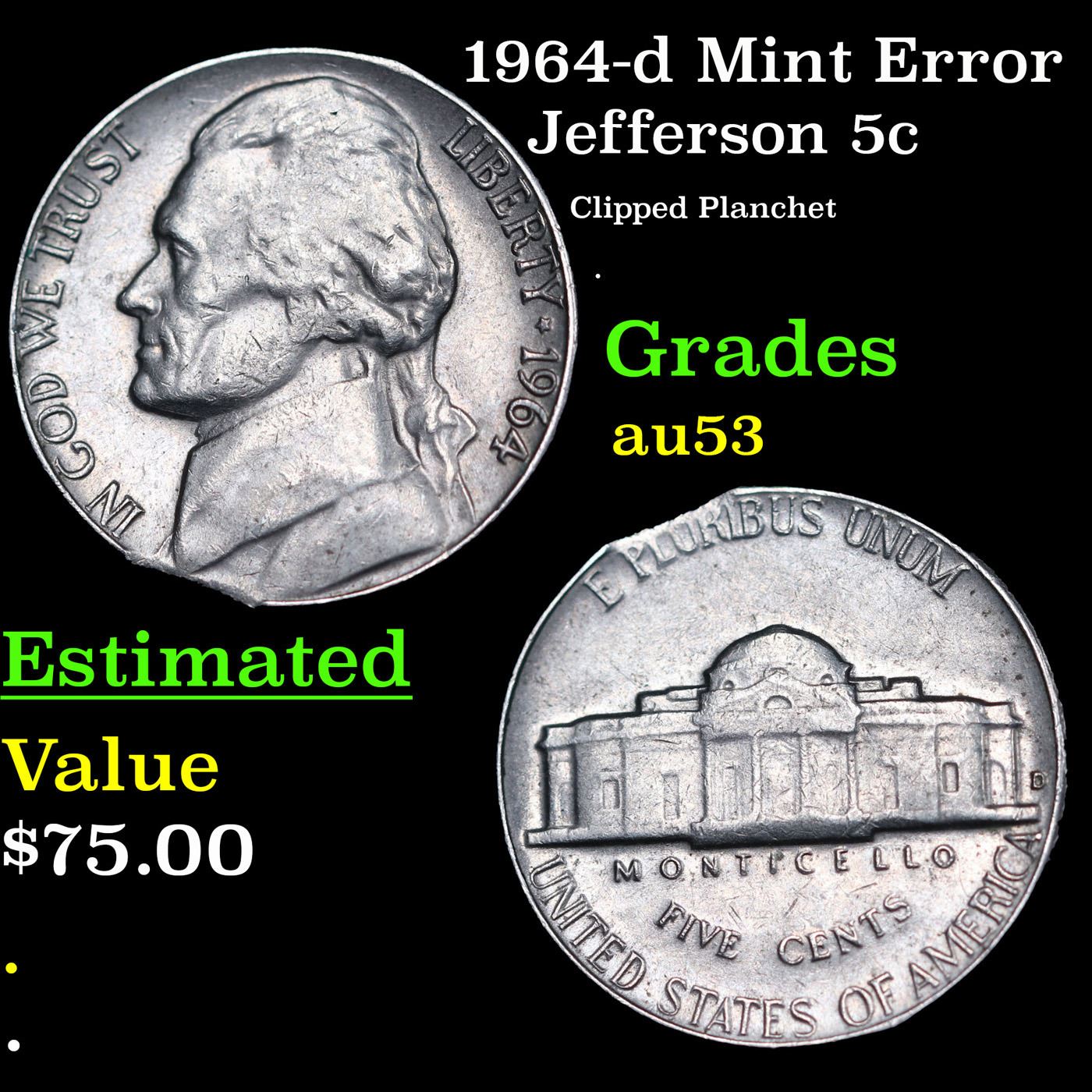 1964-d Mint Error Jefferson Nickel 5c Grades Select AU.