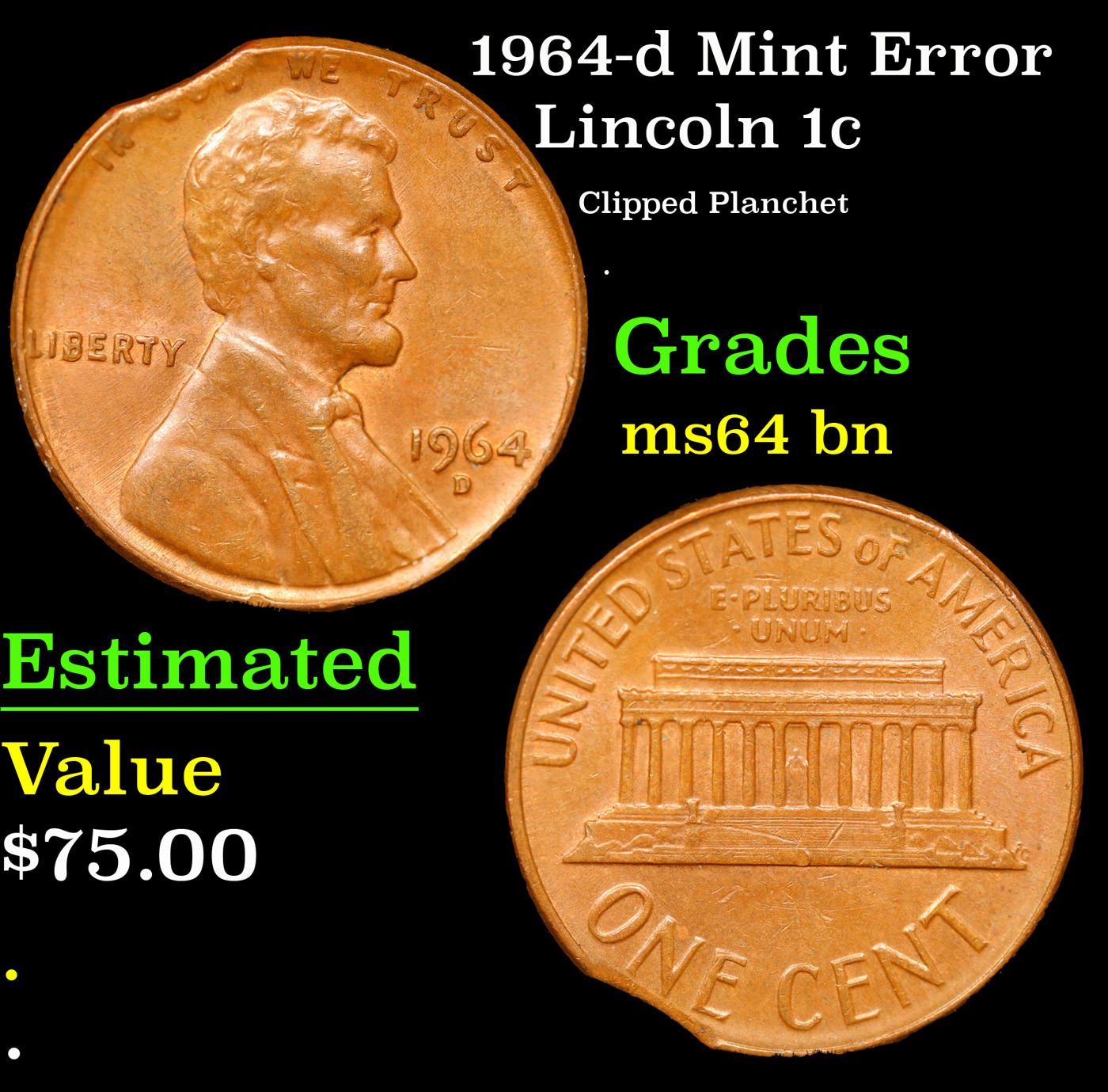 1964-d Mint Error Lincoln Cent 1c Grades Choice Unc BN.
