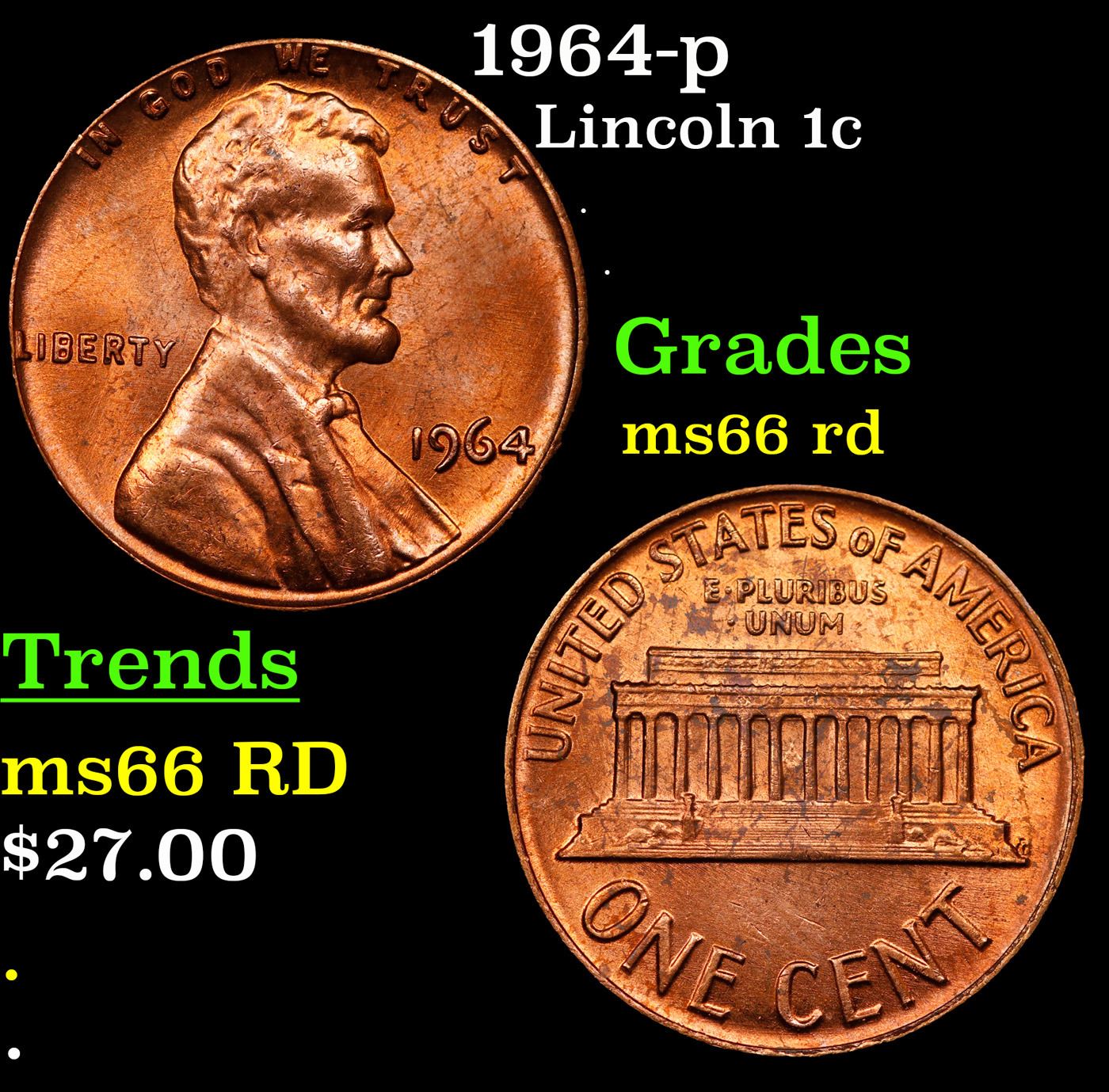 1964-p Lincoln Cent 1c Grades GEM+ Unc RD.