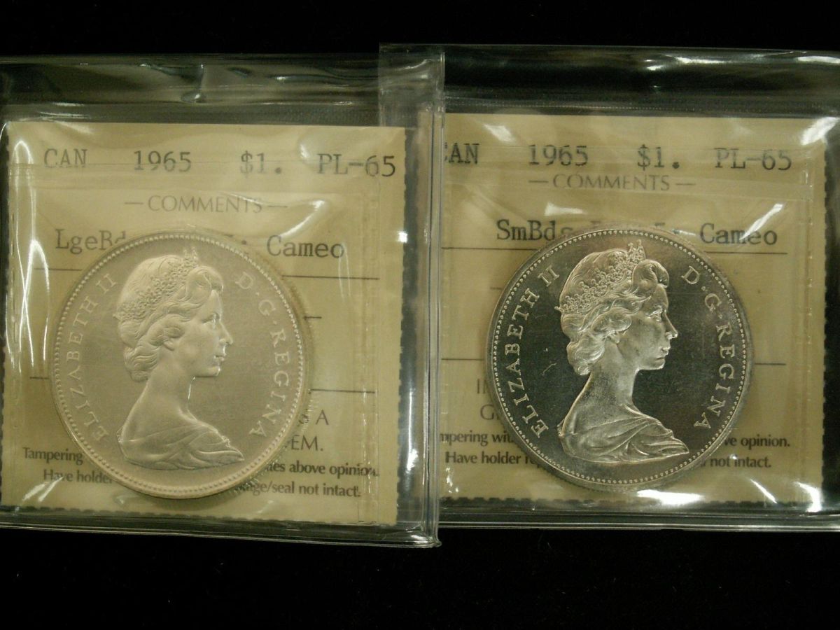 1965 $1 ICCS PL65, lot of two coins includes SmBd Ptd 5 and the LgBd Blt 5 types both designated Cameo