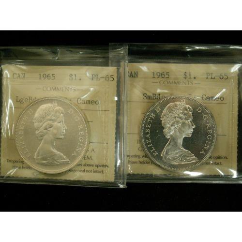 1965 $1 ICCS PL65, lot of two coins includes SmBd Ptd 5 and the LgBd Blt 5 types both designated Cameo