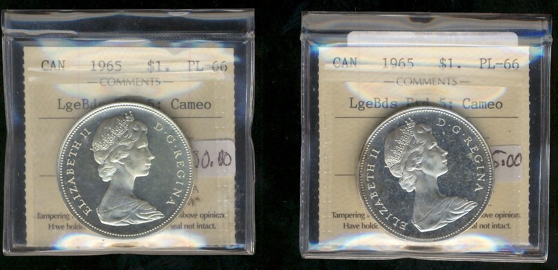 1965 $1 LgBds Blt & 1965 LgBds Ptd ICCS PL66 Cameo. Lot of 2 coins.