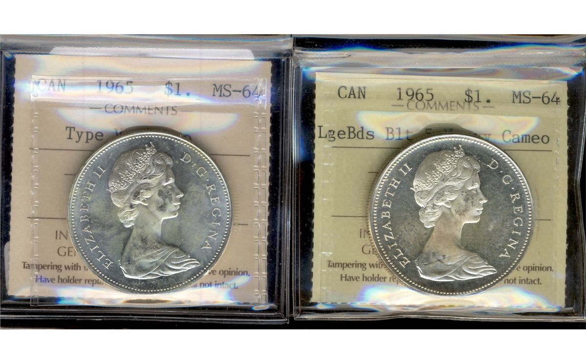 1965 $1 LgBds Blt & Type V ICCS MS64. Lot of 2 coins. Heavy Cameo and Cameo designations respectively.