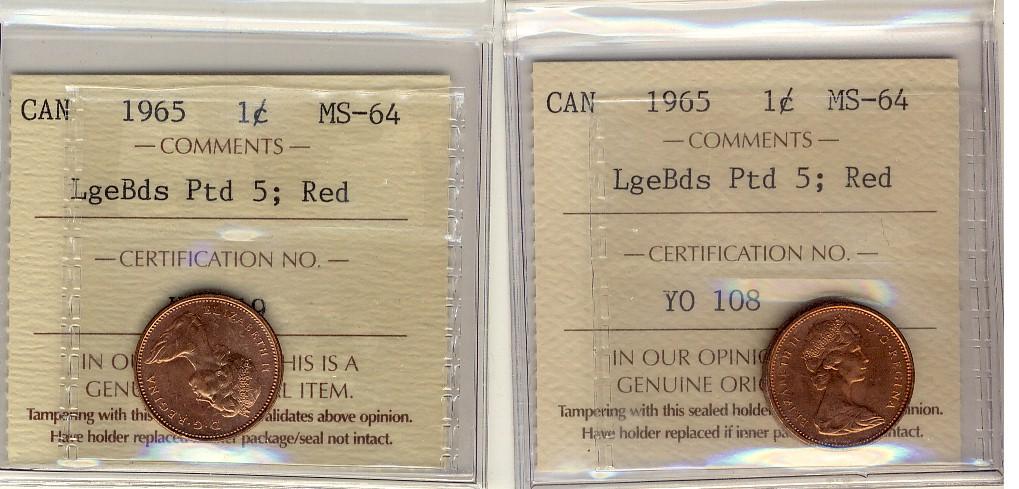 1965 1¢ LgBds Ptd 5 ICCS MS64RD, Lot of two coins both Type 4's and full red.