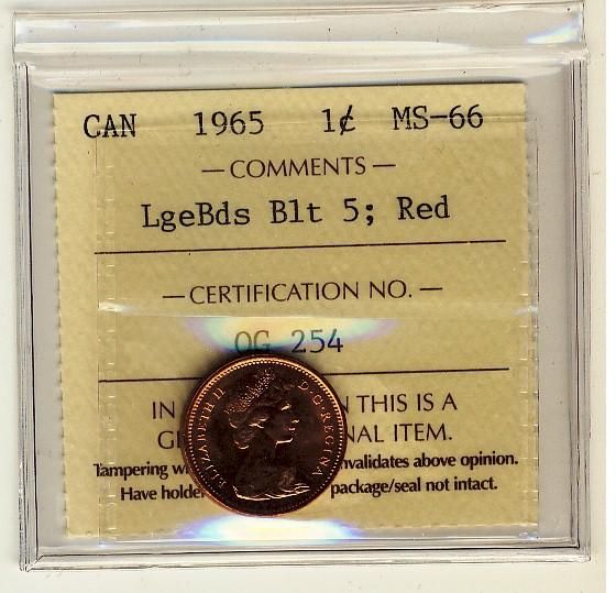 1965 1¢ LgeBds Blt 5 ICCS MS66 Full Red, A superb GEM example.