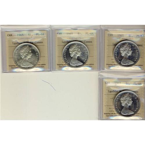 1965 $1. Lot of 4 coins all ICCS PL64 cameo. Includes LgBds Ptd 5(2) and LgBds Blt 5(2).