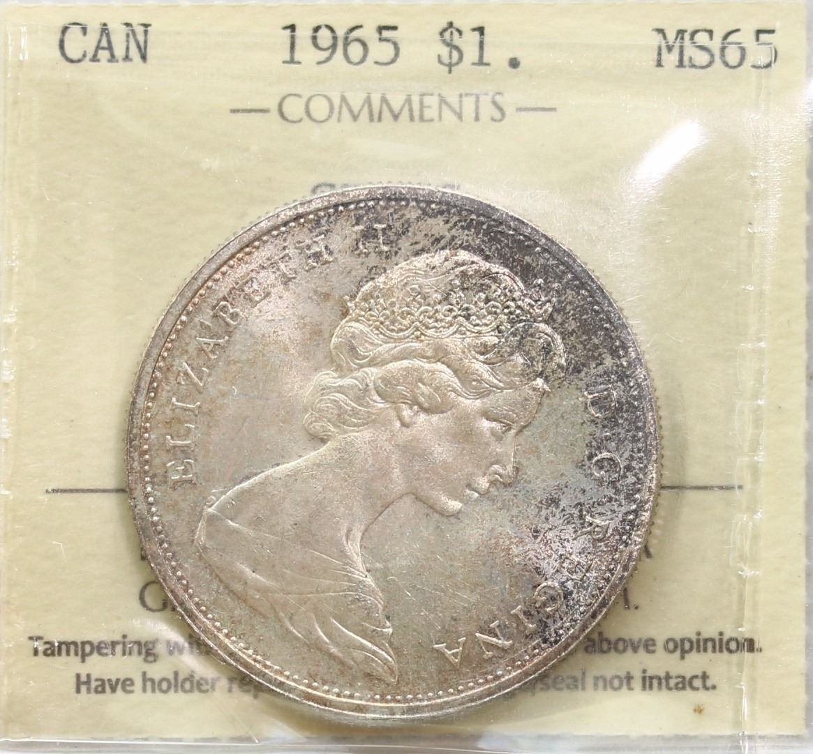 1965 $1 "SB P5" ICCS Gem Mint State-65 Delicate toning over full underlying lustre. A superior example.