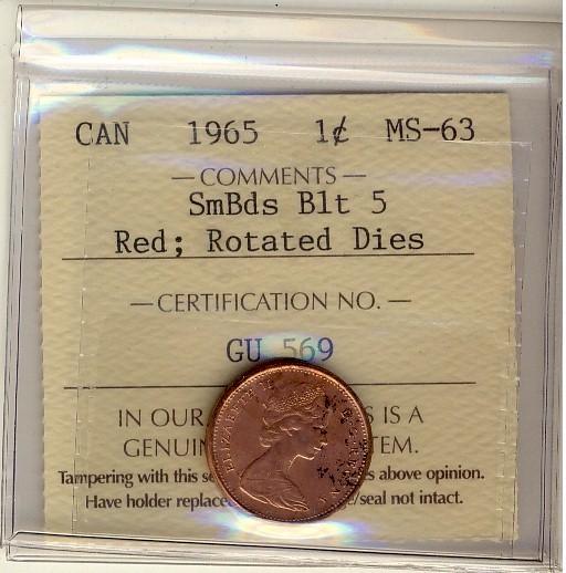 1965 1¢ SmBds Blt 5 ICCS MS63 Red; Rotated Dies,