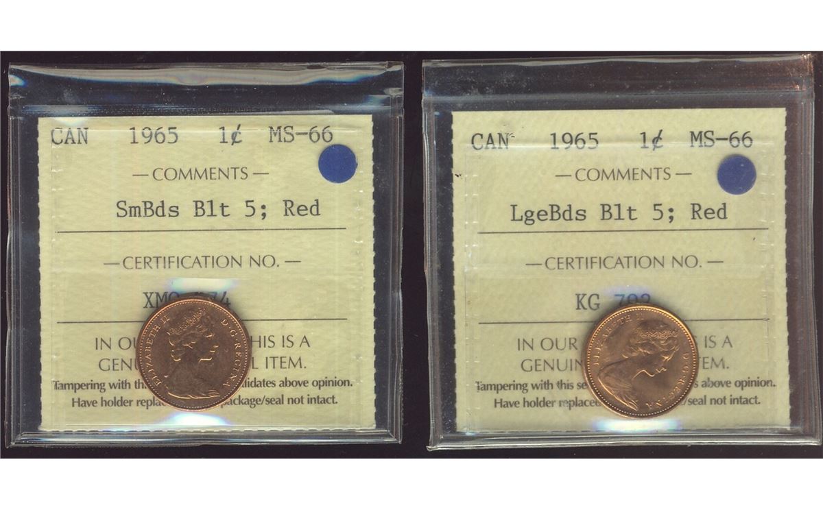 1965 1¢ SmBds Blt & LgBds Blt ICCS MS66RD. Lot of 2 coins.