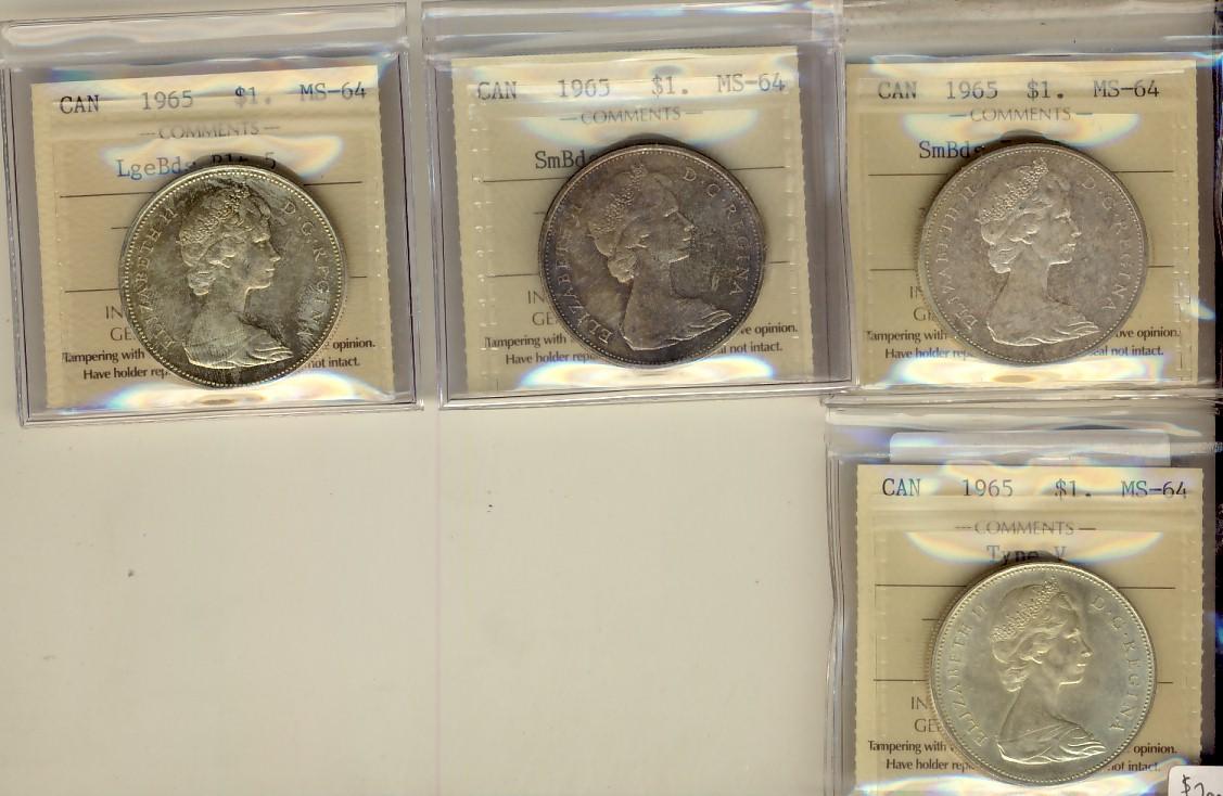 1965 $1 SmBds Blt, SmBds Ptd, Lgbds Blt & Type V ICCS MS64. Lot of 4 coins.