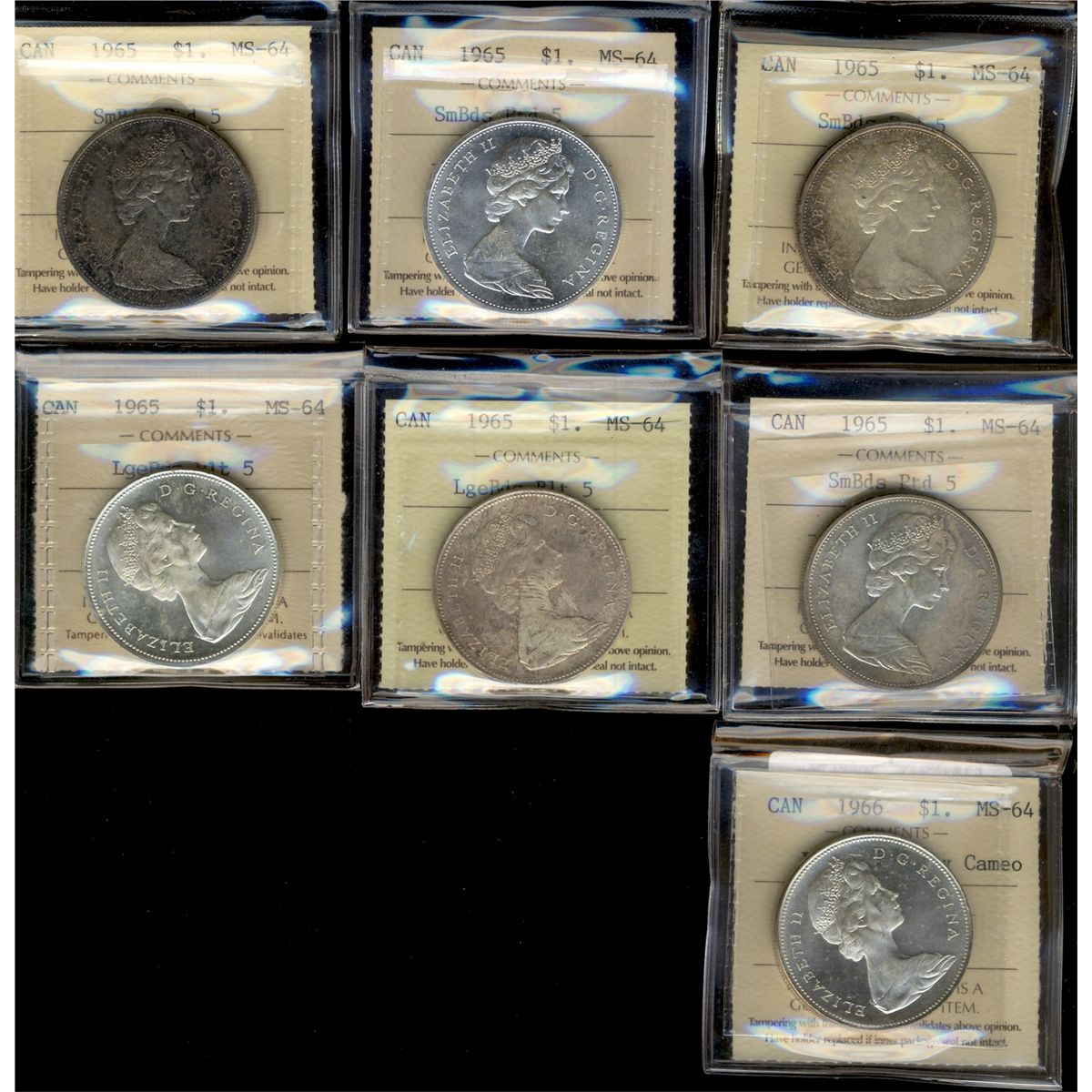 1965 $1 SmBds Ptd(4), LgBds Blt(2) & 1966 LgBds all ICCS MS64. Lot of 7 coins.