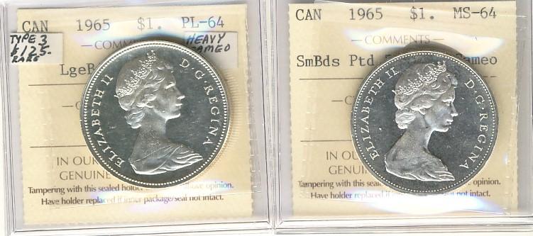 1965 $1 SmBds Ptd Heavy Cameo MS64 & LgBds Blt 5 PL64. Lot of 2 ICCS coins.