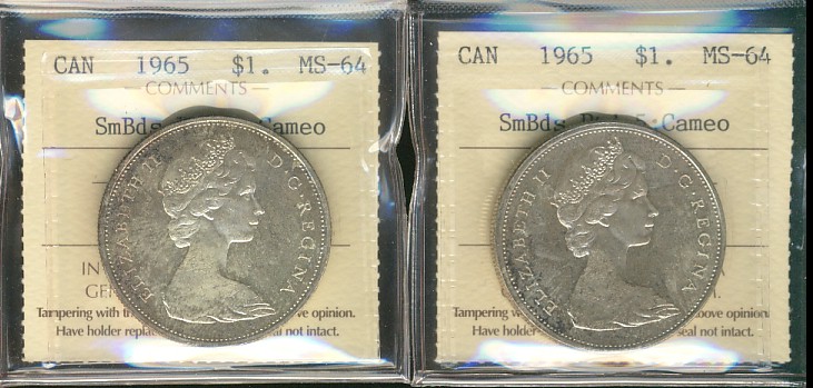 1965 $1 SmBds Ptd ICCS MS64 Cameo. Lot of 2 coins.