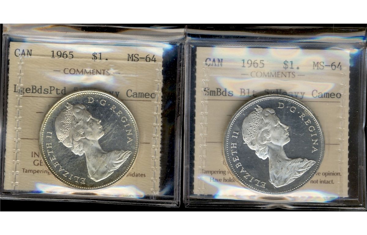 1965 $1 SmBds Ptd & LgBds Ptd ICCS MS64 Heavy Cameo. Lot of 2 coins.