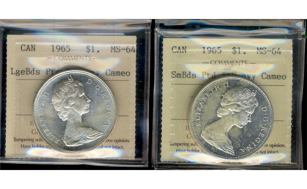 1965 $1 SmBds Ptd & LgBds Ptd ICCS MS64 Heavy Cameo. Lot of 2 coins.