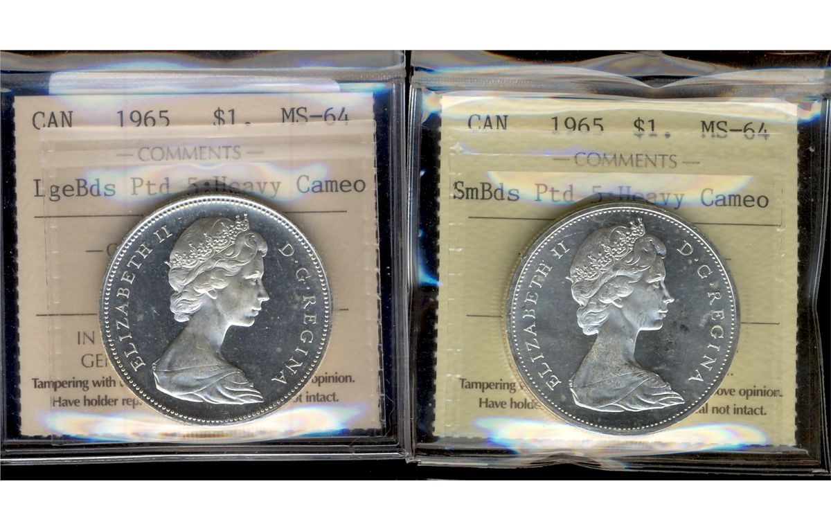 1965 $1 SmBds Ptd & LgBds Ptd ICCS MS64 Heavy Cameo. Lot of 2 coins.