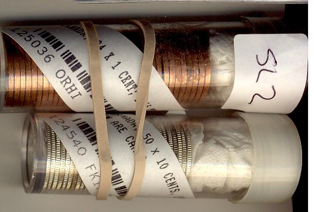 1965 1¢ Type 1 & 1958 10¢. Lot of two partial BU rolls. Includes 34 x 1¢ and 31 x 10¢.