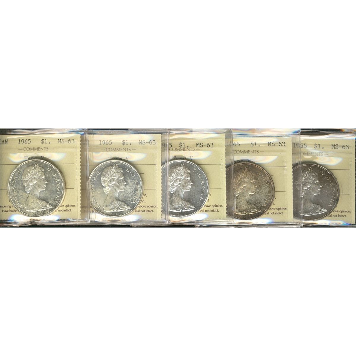 1965 $1 Type V ICCS MS63. Lot of 5 coins.