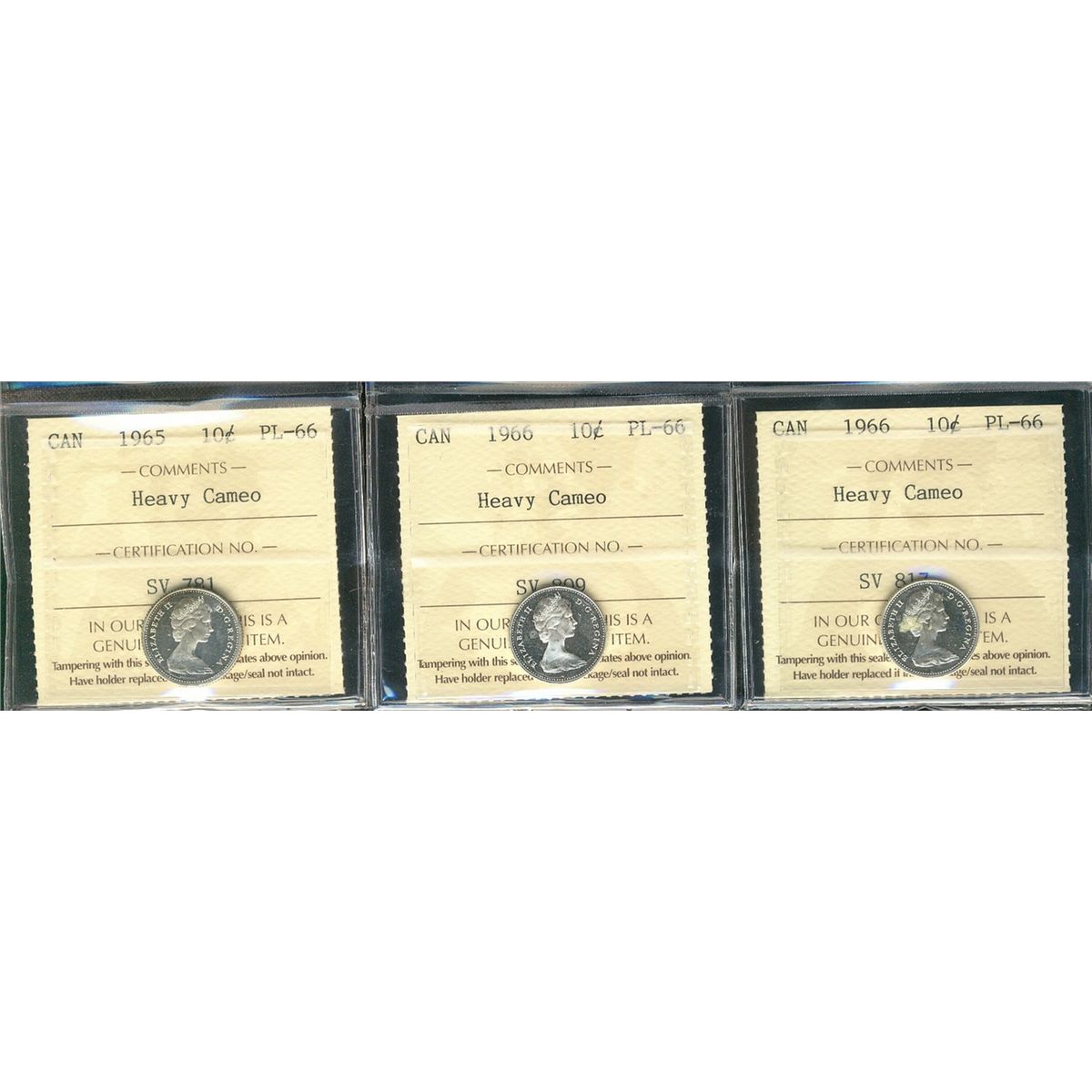 1965 & 1966(2) 10¢ ICCS PL66 Heavy Cameo. Lot of 3 coins.