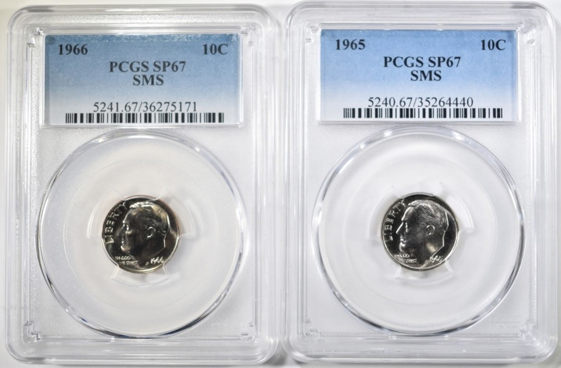 1965 & 1966 SMS ROOSEVELT DIMES, PCGS SP-67