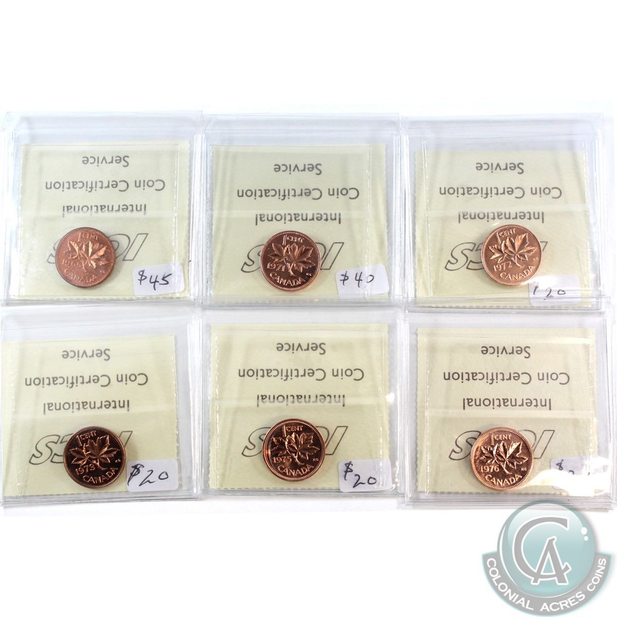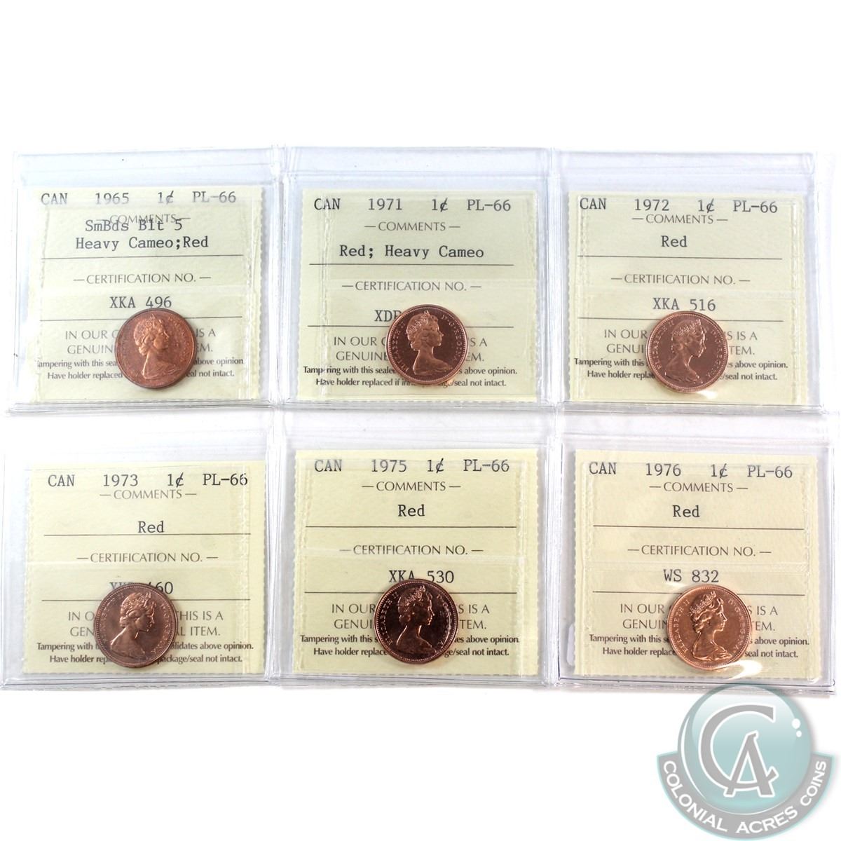 1965-1976 Canada 1-cent ICCS Certified PL-66 Red Collection. You will receive 1965 SmBds Blt 5 Heavy Cameo, 1971 Heavy Cameo, 1972, 1973, 1975, and 1976. 6pcs.