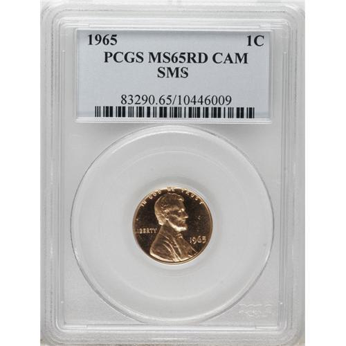 <B>1965 1C SMS MS65 Red Cameo PCGS.</B></I> Exquisitely struck on the devices, along with gorgeous copper-gold luster. A few minute obverse handling marks preclude a higher grade, and a couple of inoffensive, as-made planchet flaws are noted in the lower reverse field. Population: 25 in 65 Red Cameo, 5 finer (1/07).<BR><BR><b>Shipping:</b> Coins & Currency (<a target="_blank" href="http://www.heritageauctions.com/common/shipping.php">view shipping information</a>)
