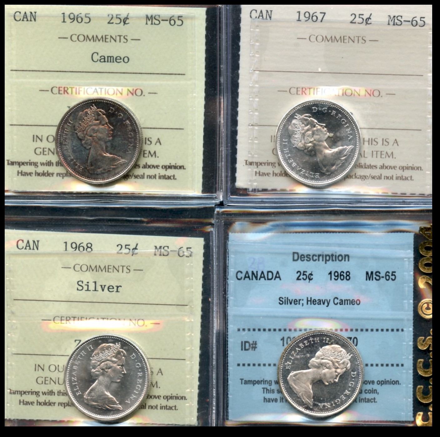 1965 25¢, 1967, 1968 Silv(2). Lot of 3 ICCS and 1 CCCS Heavy Came graded coins.