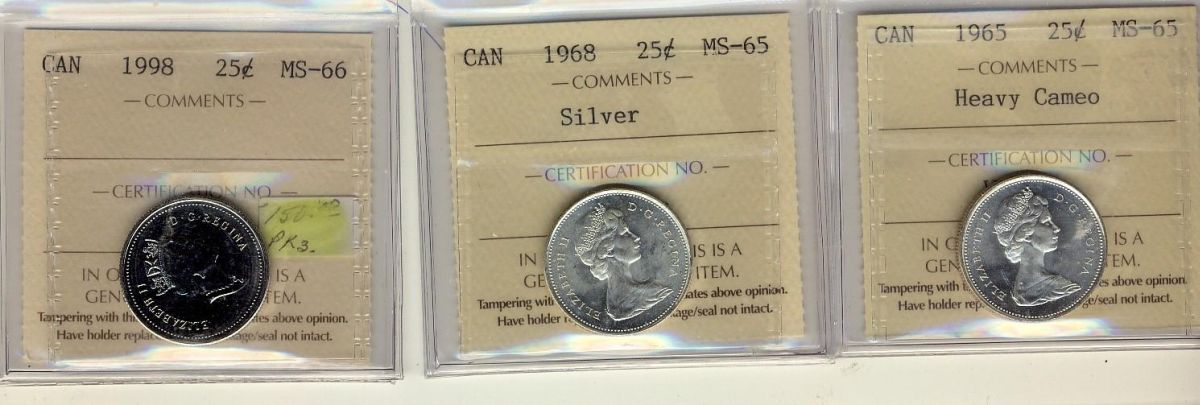 1965 25¢ ICCS MS65 Heavy Cameo, 1968 Silver MS65, 1998 MS66, Lot of 3 coins all certified ICCS,